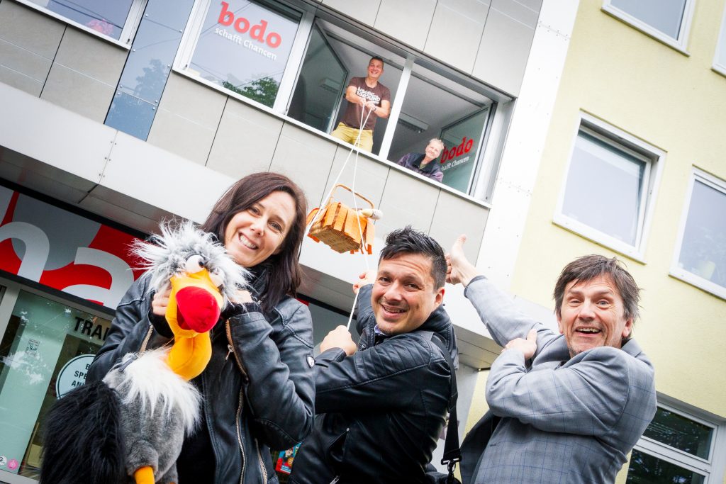 Zu den Vorstellungen des einzigartigen Ruhrpott-Karnevals gehört seit vielen Jahren die Spendenaktion für den bodo e.V.: Die Gäste werfen die Wertmarken, die sie nicht verwendet haben, in eine große Spendenbox. Den Gegenwert spendet das Ensemble am Ende an die Wohnungslosenhilfe des Vereins. In dieser Spielzeit sind ganze 7.725 Euro herausgekommen. Jetzt kamen Sandra Schmitz, Murat Kayi und Martin Kaysh vorbei, um sie zu übergeben.