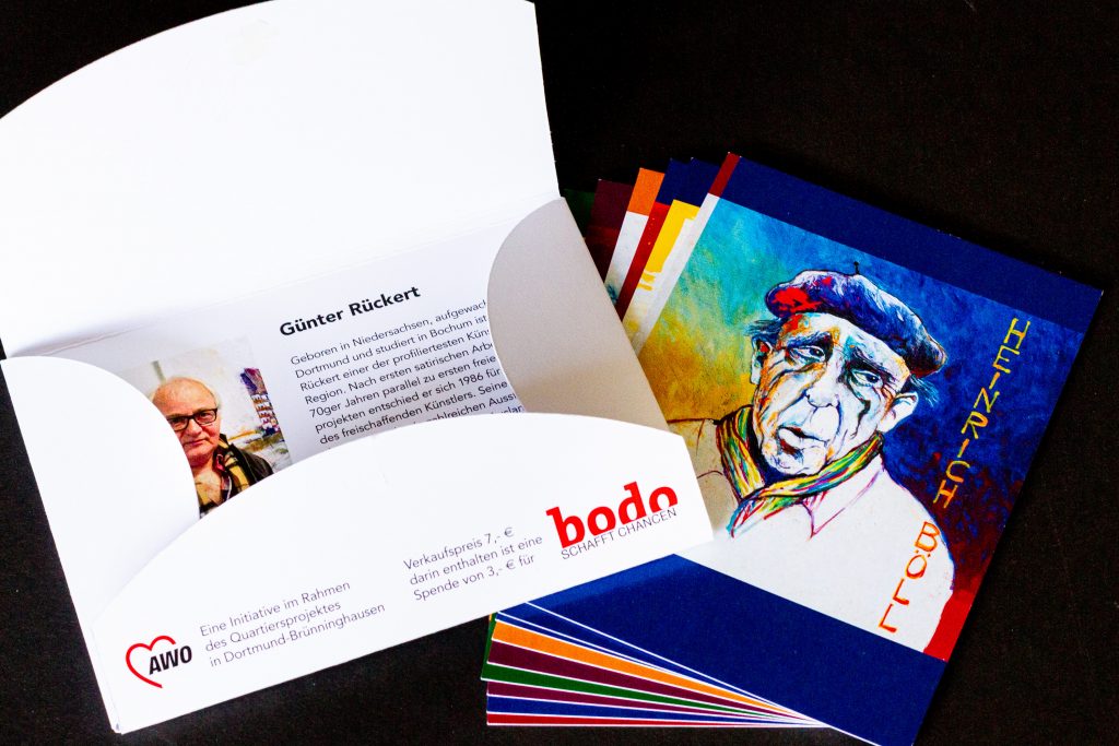 Nun hat die AWO ein besonderes Projekt ins Leben gerufen: zehn Porträts bedeutender Persönlichkeiten, von Günter Rückert gemalt und zum hochwertigen Postkarten-Set zusammengestellt. Und: Das Set ist nicht nur ein schönes Geschenk, sondern auch eine Spendenaktion für bodo, denn ein Teil des Erlöses kommt als Spende unserer Arbeit zu Gute. Eine tolle Idee – vielen Dank!