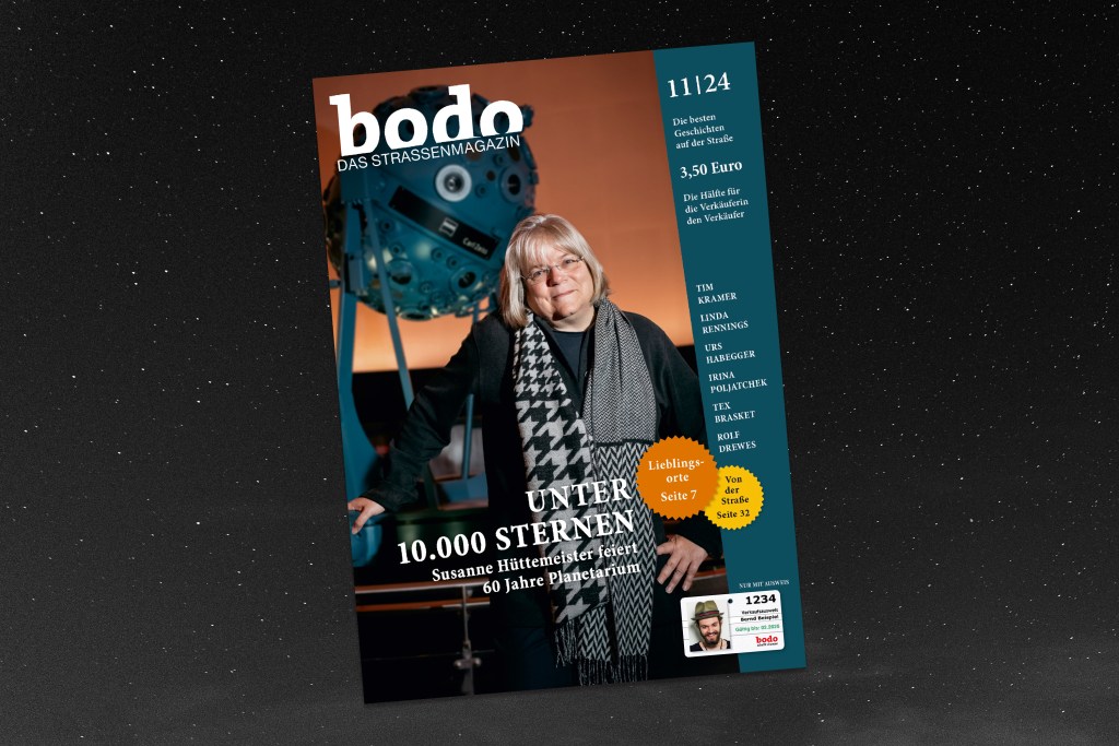 Susanne Hüttemeister feiert 60 Jahre Planetarium, Linda Rennings erzählt von weiblicher Obdachlosigkeit, Tim Kramer schafft Begegnungsformen gegen Einsamkeit, Ika Sperling wird erste Dortmunder Comic-Stadtschreiberin, Matthias Frense wechselte aus der freien Szene auf den Posten des Bochumer Kulturbüro-Chefs ‑ das Straßenmagazin im November.