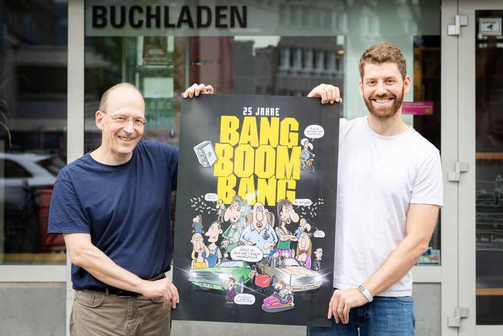Was für eine schöne Aktion: Als im September die Ruhrgebiet-Kultkomödie „Bang Boom Bang“ 25. Jubiläum feierte, hat der Bochumer Cartoonist und Bestseller-Autor Oli Hilbring ein Plakat in A1 gestaltet, das exklusiv über bodo verkauft wurde.